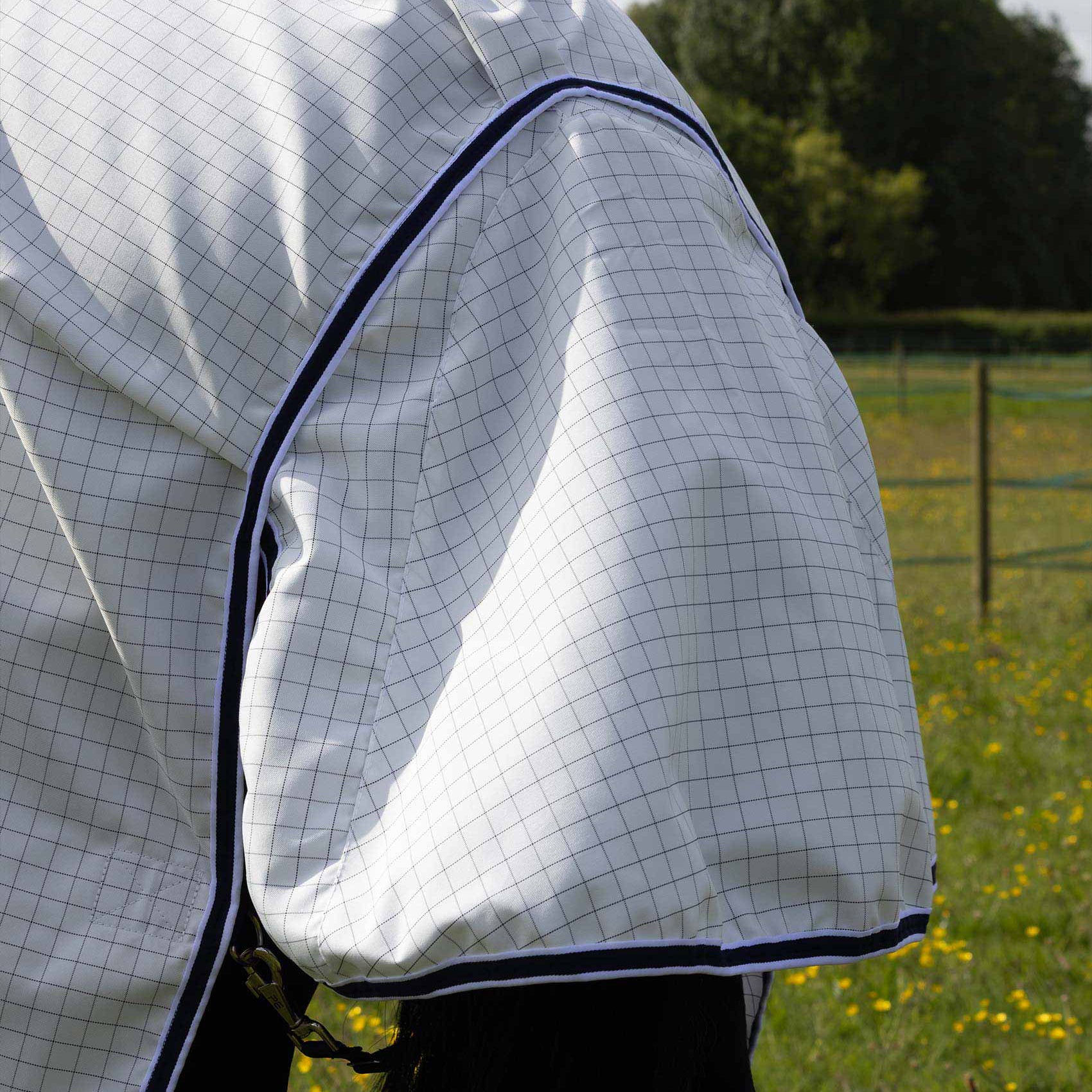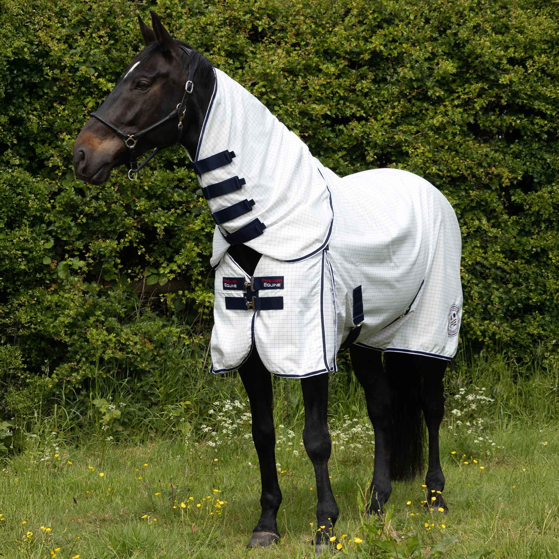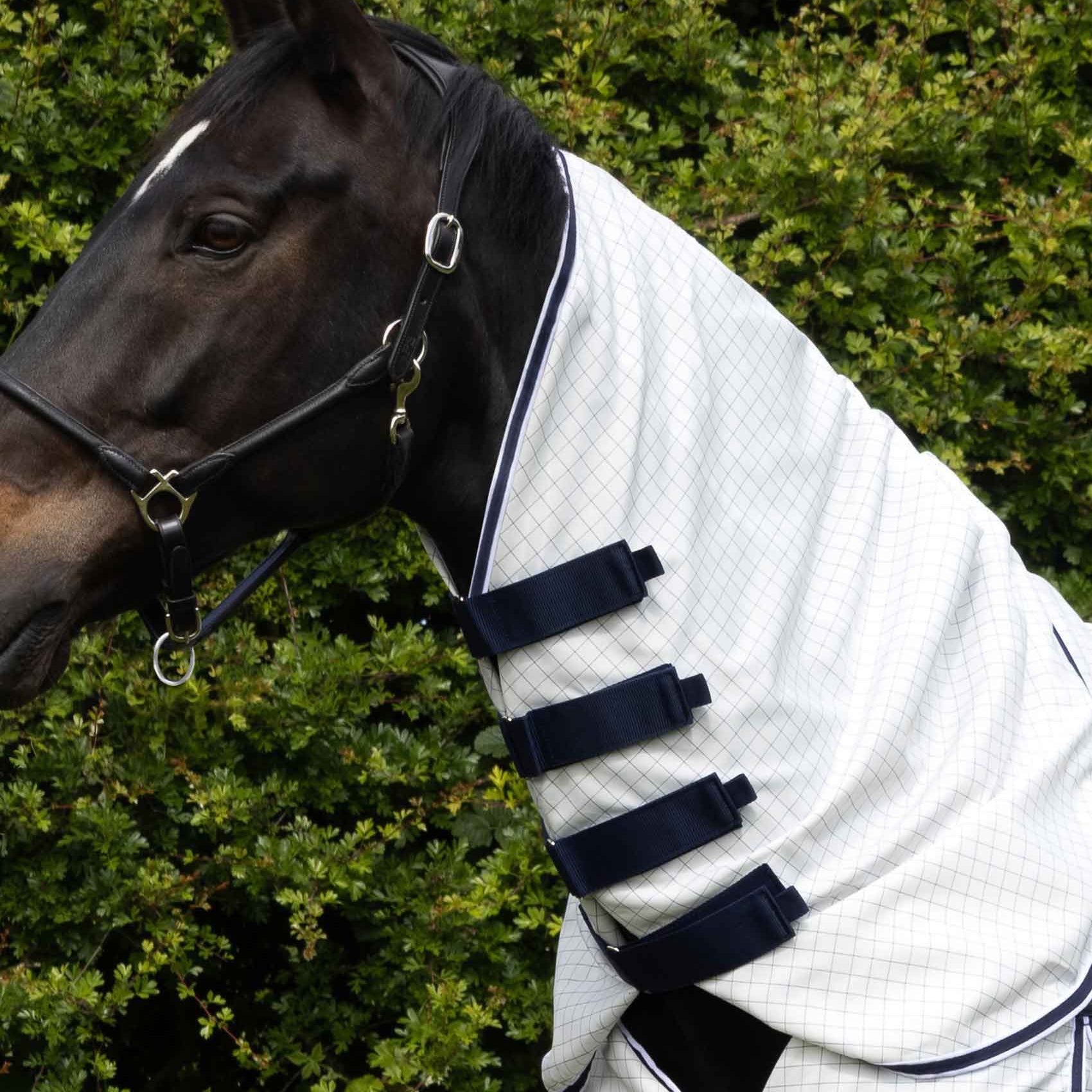 Son couvre-encolure intégré garantit une protection continue de la tête à la queue. La doublure antibactérienne et antistatique au niveau de la crinière, du garrot et des épaules réduit les risques de frottements et améliore le confort général du cheval. Conçue pour offrir une grande liberté de mouvement et un ajustement sûr, cette chemise en coton est équipée d’un large soufflet d’épaule, d’arcs pour les antérieurs et postérieurs, de doubles fermetures de poitrail en T, de sangles croisées réglables et d’une courroie de queue enduite de PVC.