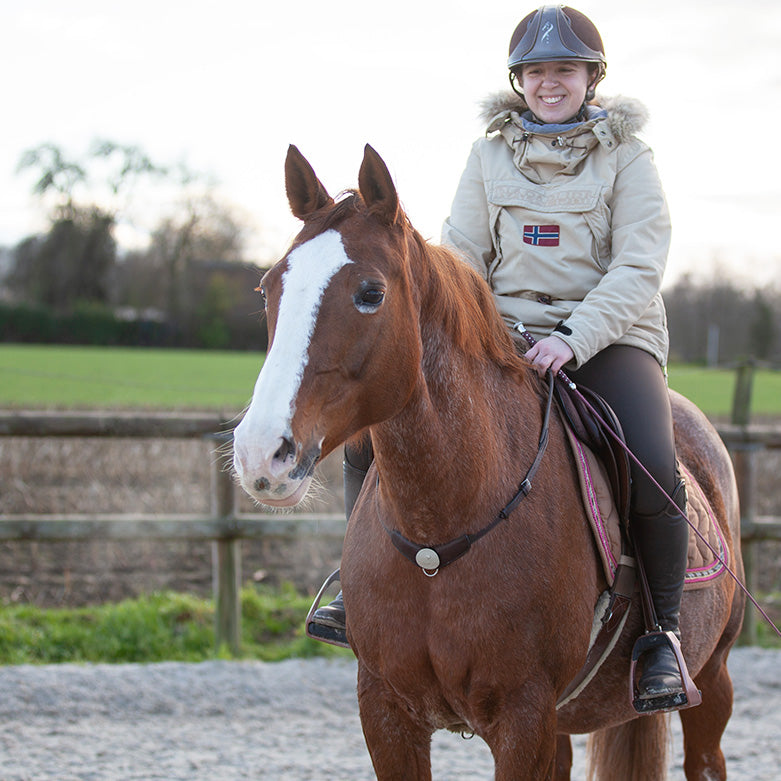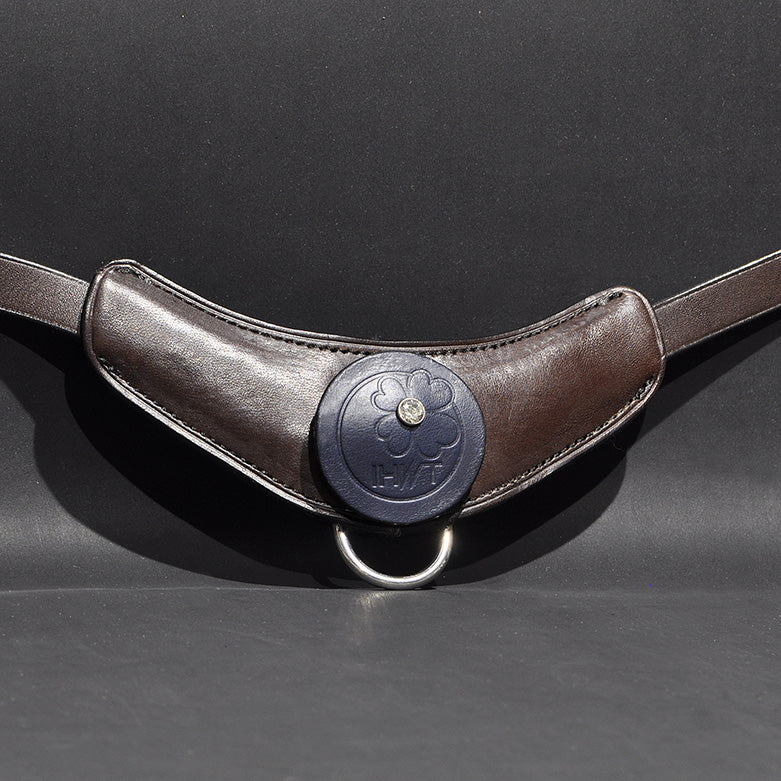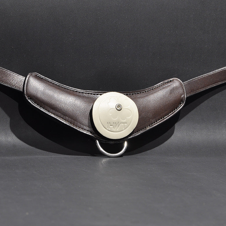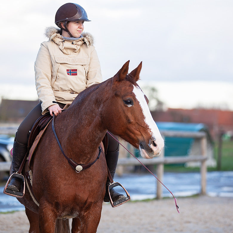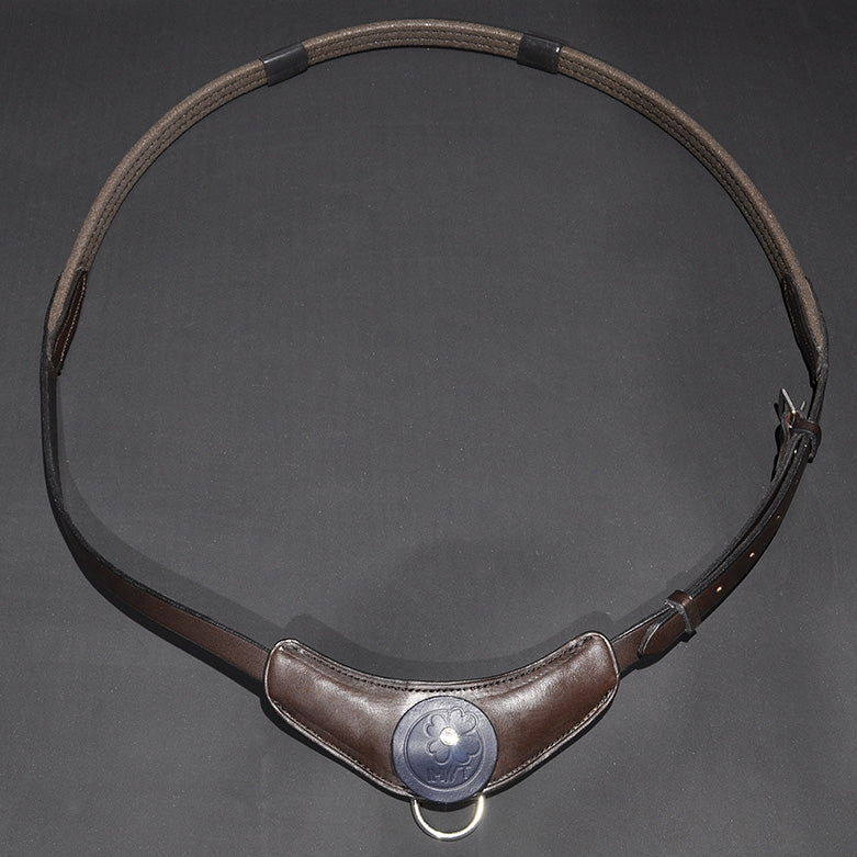 La pièce en cuir avec le logo comprend un anneau qui permet d’y attacher une longe et effectuer le travail à pied.