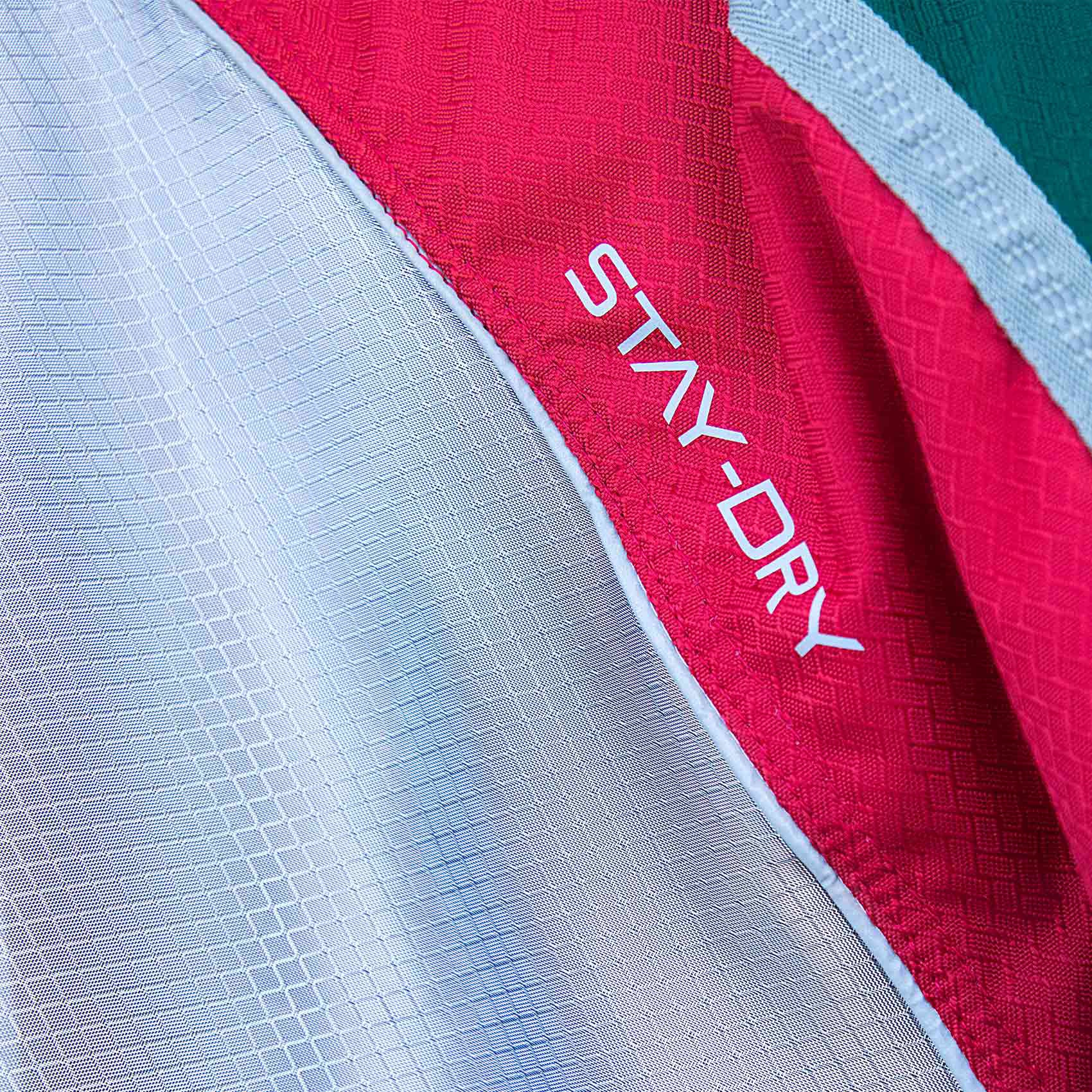 Elle combine une partie supérieure imperméable et respirante en matériau 600D avec une partie inférieure en nylon interlocking léger, réfléchissant les UV à environ 70 %.