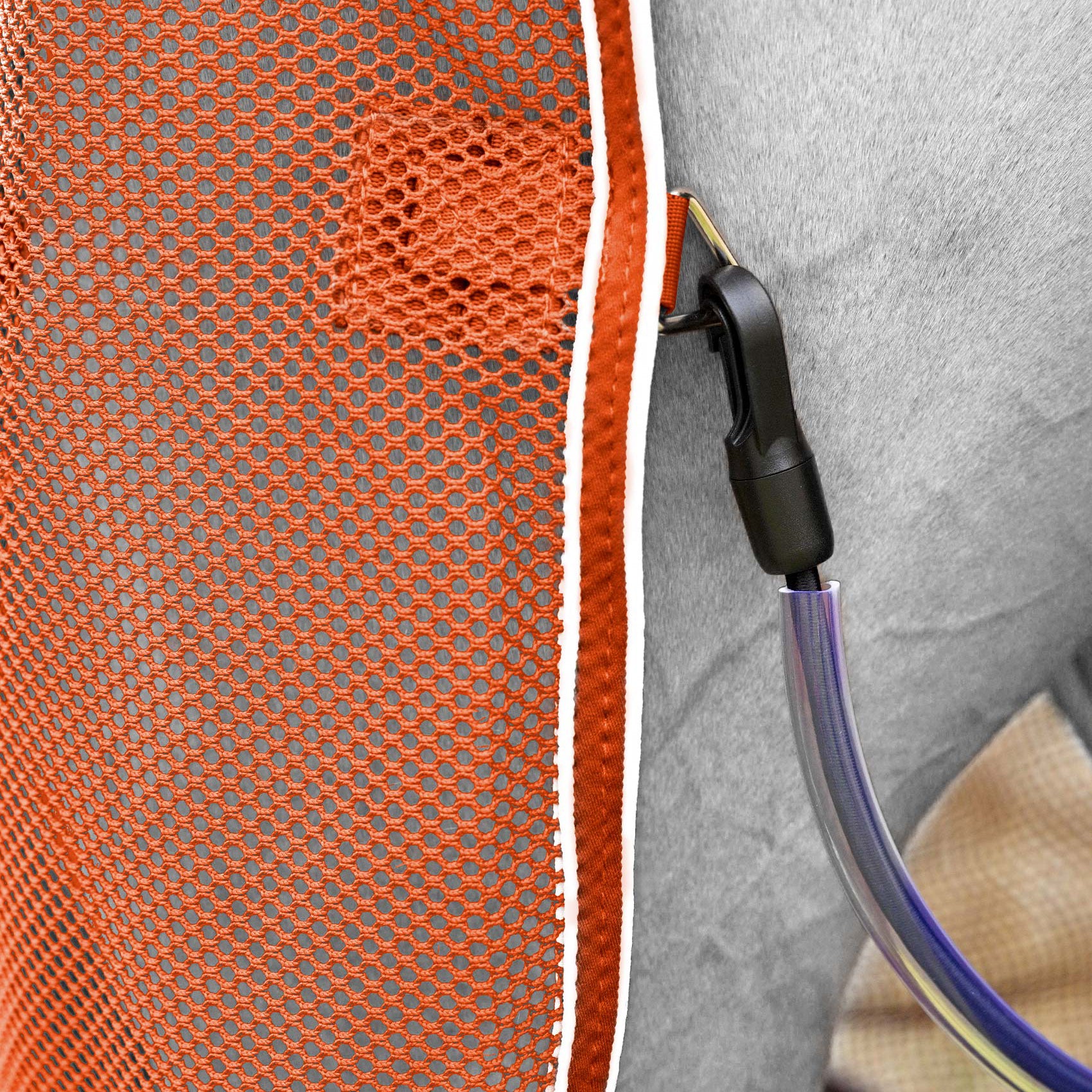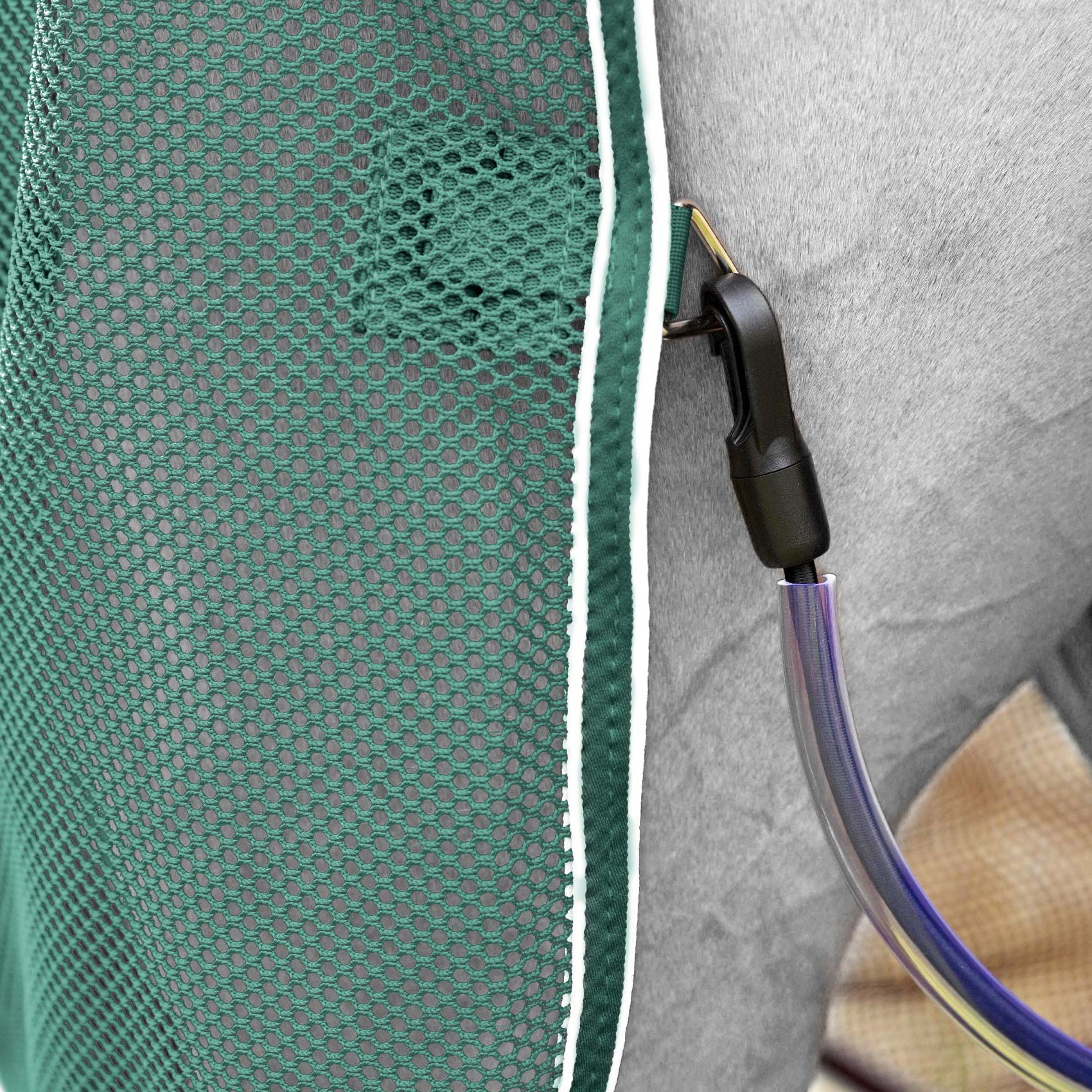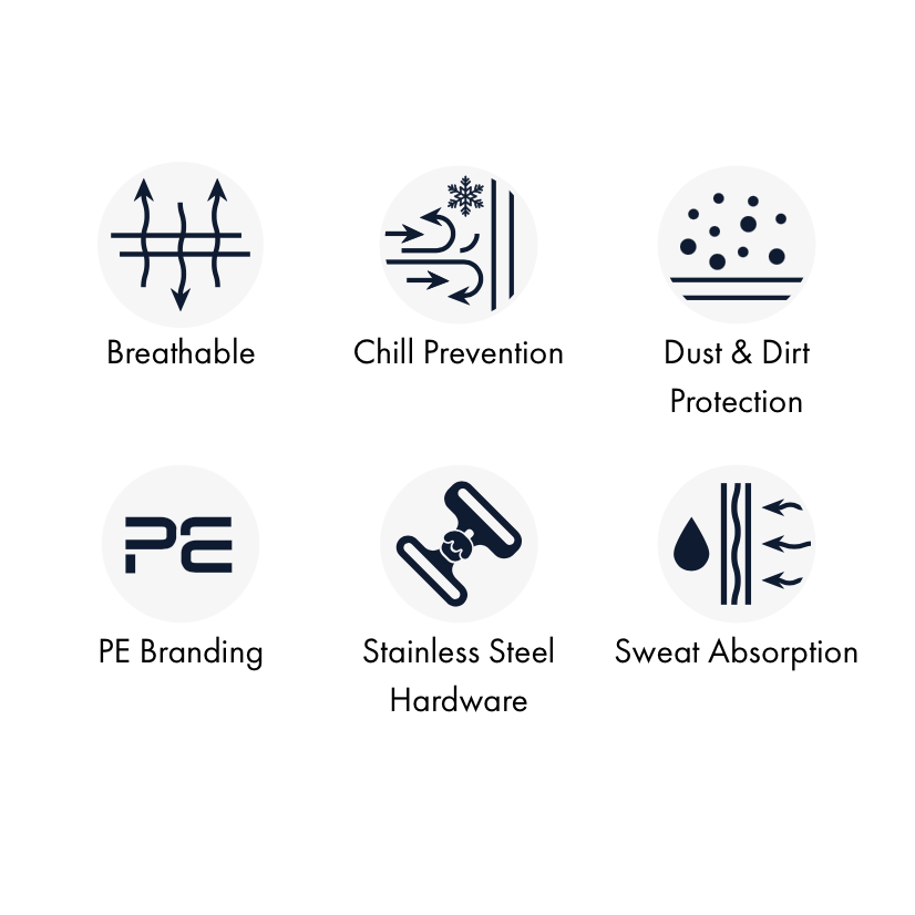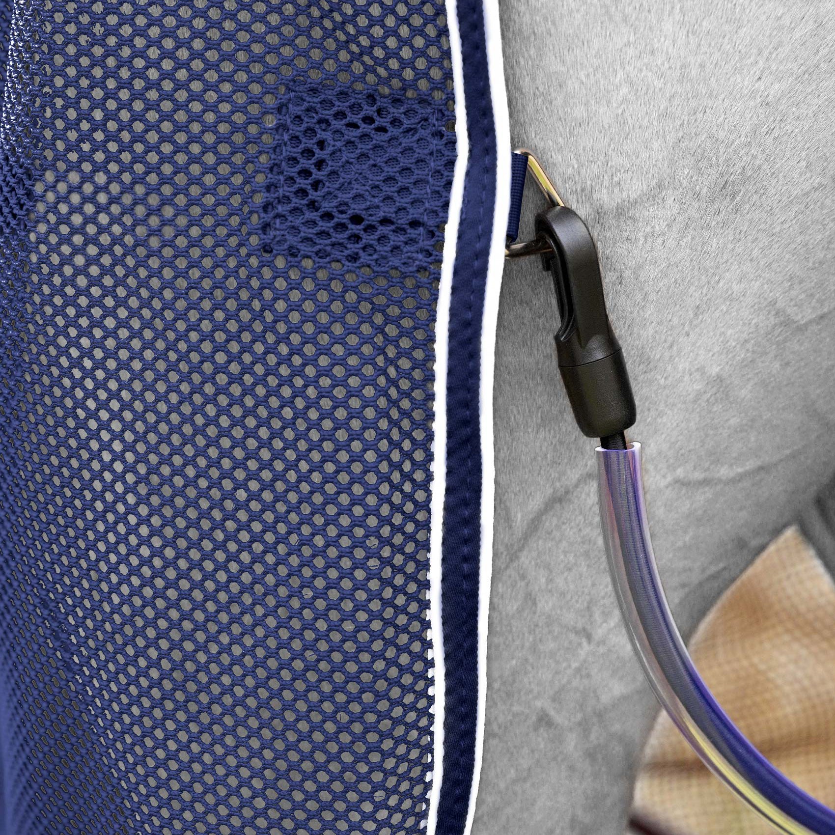 Des panneaux latéraux en mesh léger et raffiné assurent une ventilation optimale, garantissant le confort du cheval par temps chaud ou lors des déplacements. La double fermeture frontale en T avec sangle à double verrouillage offre un maintien sûr tout en conservant un aspect sophistiqué, tandis que les surpiqûres de stabilisation à l’encolure préservent un ajustement parfait. La courroie de queue légère et facile à nettoyer ajoute une touche pratique sans compromettre le style, faisant de cette couverture séchante un modèle de luxe et de fonctionnalité.