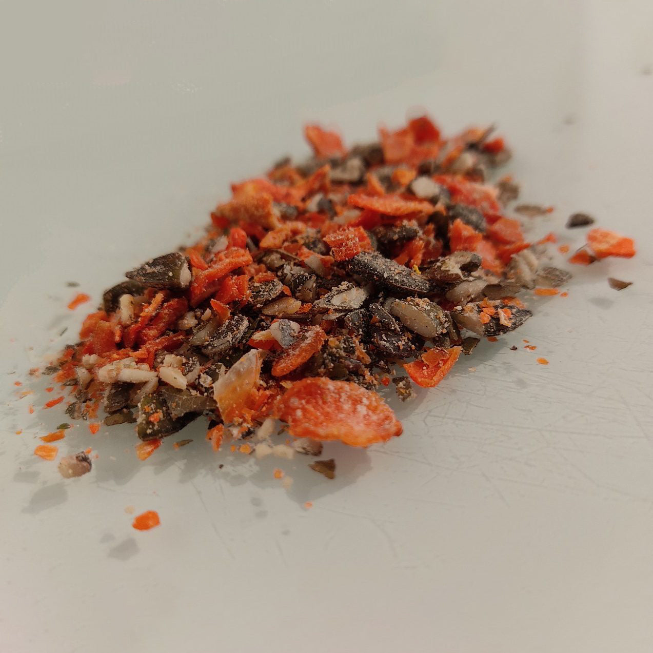- Carotte, feuille de noyer et graine de courge : Effet assainissant sur le transit, antioxydante, apporte de l’appétence, contribue à améliorer l’état général et la qualité de la peau, du poil et de la corne.