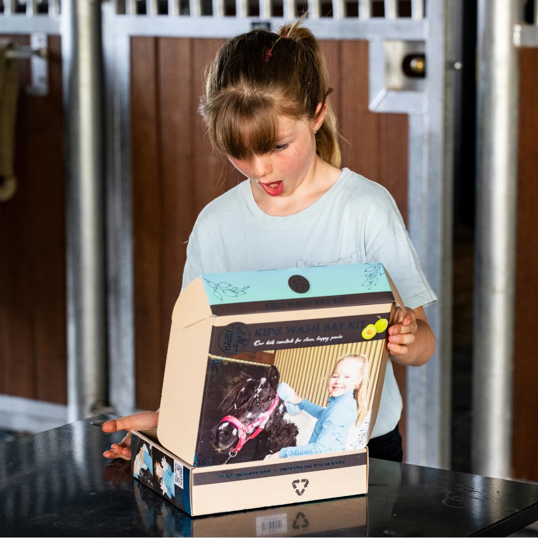 Le Hairy Pony Kids Wash Bay Kit est le moyen idéal d'inspirer les enfants à prendre en charge le moment du bain de leur poney. Composé de versions miniatures de nos indispensables de lavage les plus vendus, ce kit est fait pour les petites mains, les grandes imaginations et les poneys heureux. Des couleurs vives, des ingrédients naturels et des matériaux durables en font un incontournable pour chaque jeune soigneur !