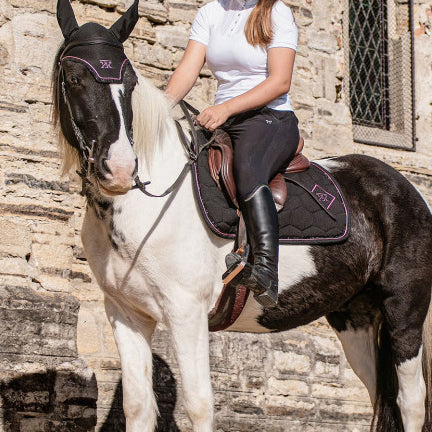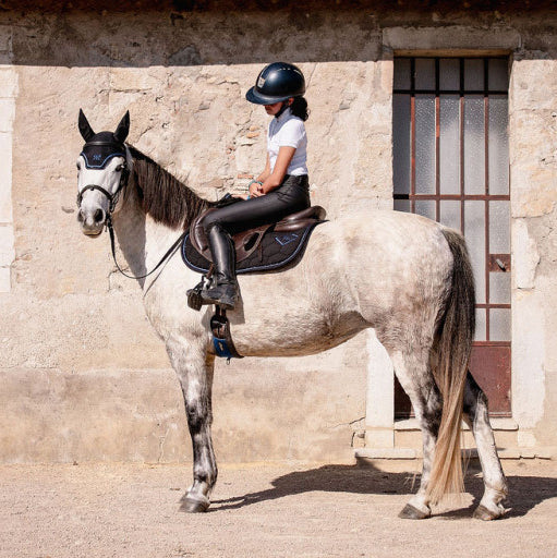 une coupe ergonomique et stable sous la selle, une matière respirante et absorbante, et une fabrication durable qui allie confort du cheval et élégance du cavalier.