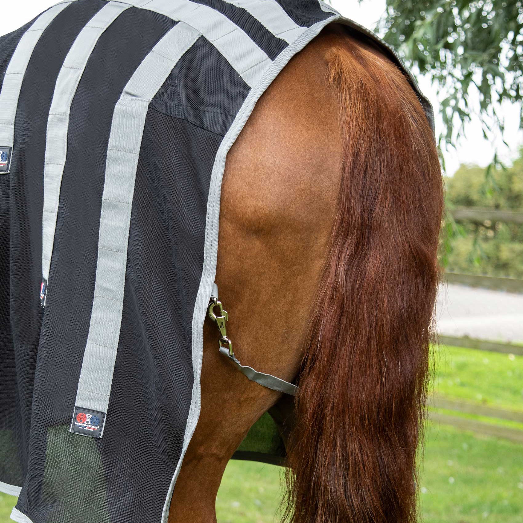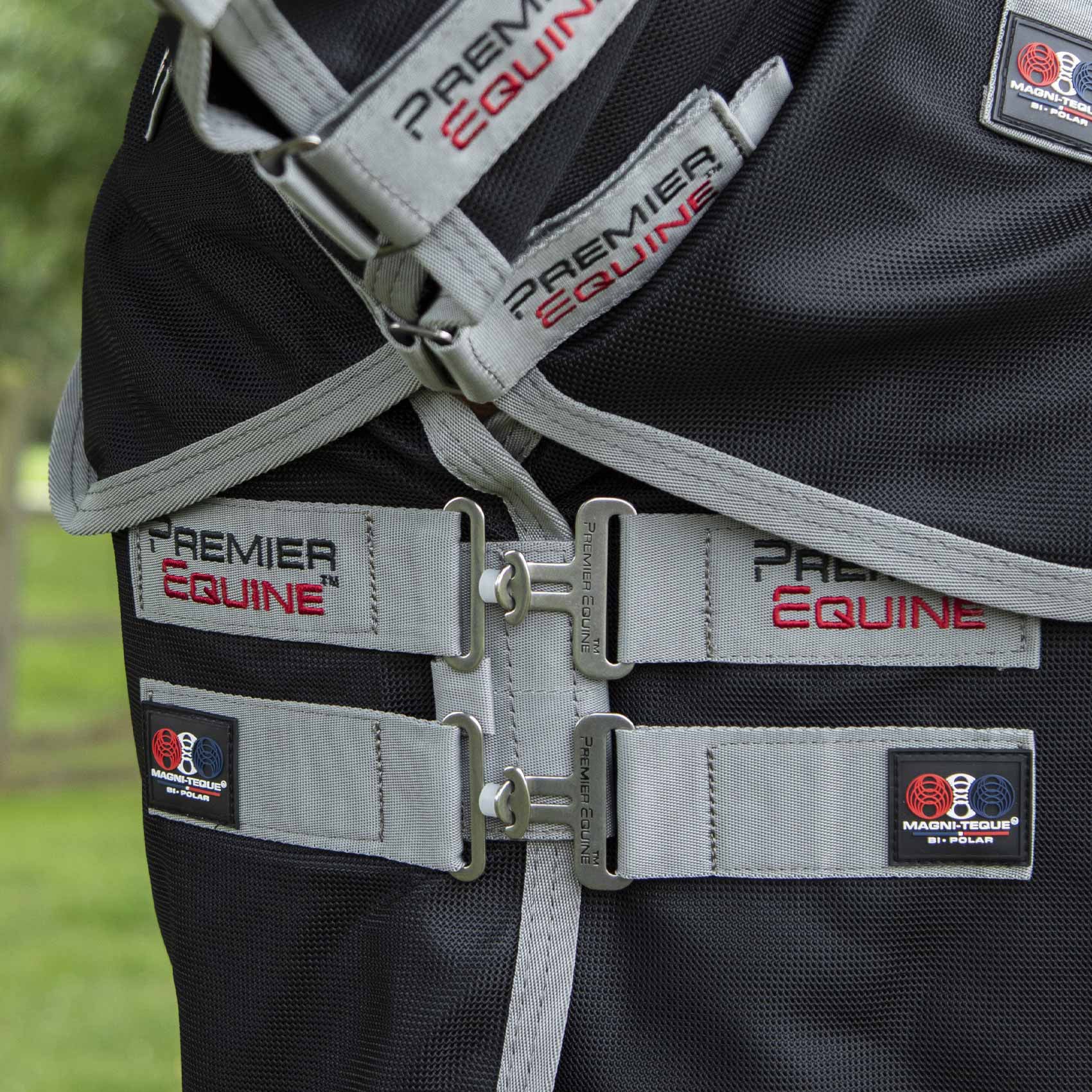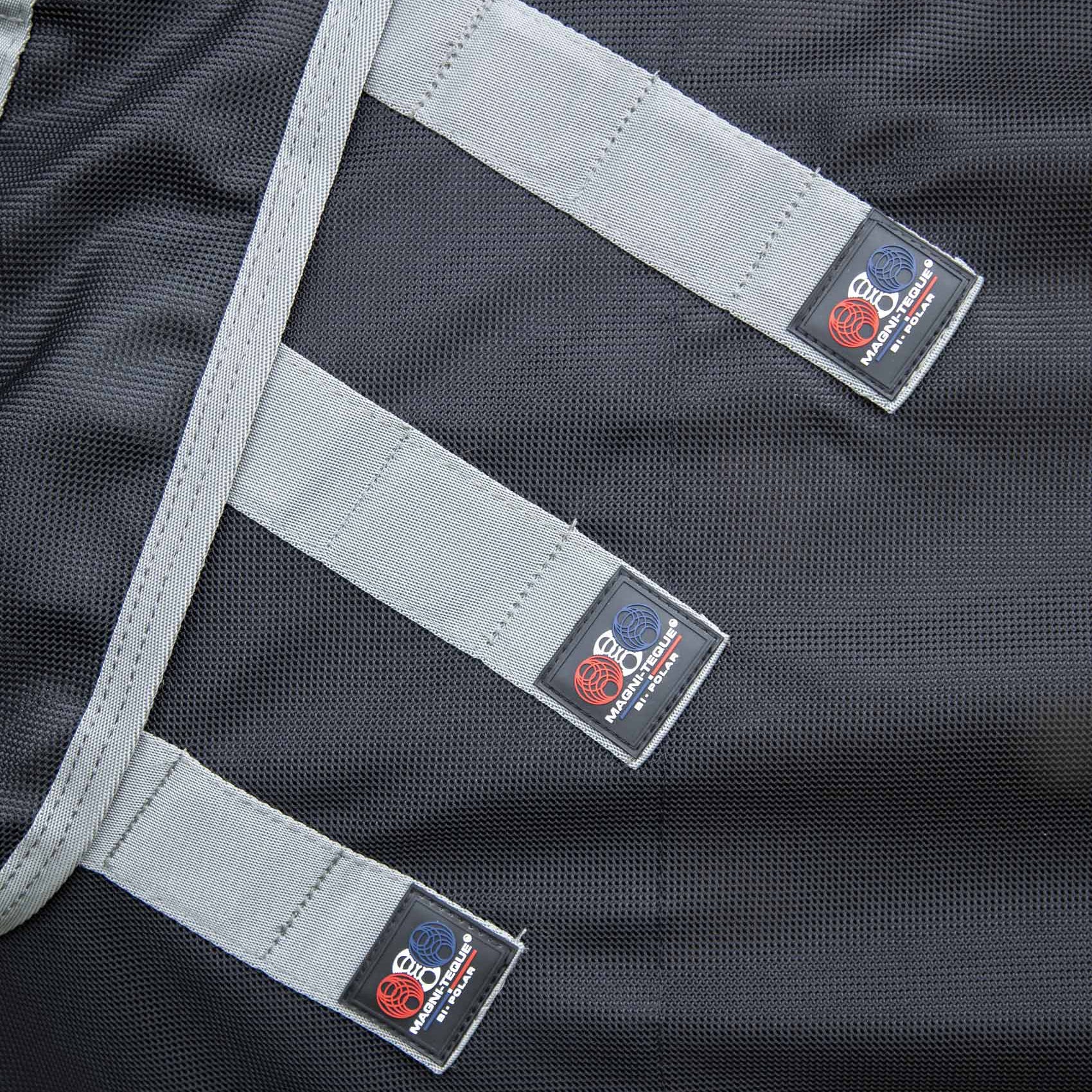 La couverture Magni-Teque avec couvre cou de chez Premier Equine est équipée d'aimants cousus dans le couvre cou et la couverture autour des principaux groupes musculaires du corps du cheval.