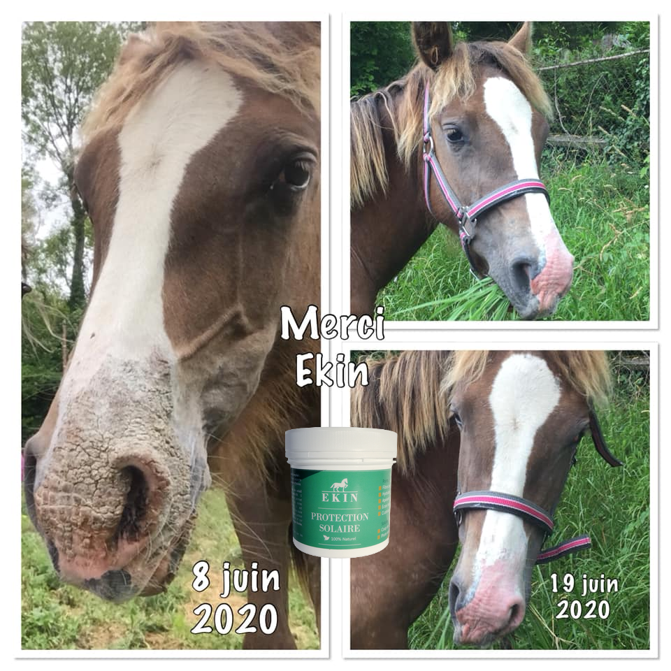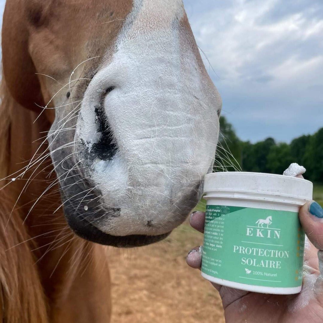 EKIN Protection Solaire apporte une protection solaire efficace. Il prévient les coups de soleil grâce à ses filtres naturels (non transformés sous forme de nanoparticules). Il est waterproof et visible. Il ne coule pas et peut s’appliquer autour des yeux et des naseaux et sur des zones de peau fragilisée.