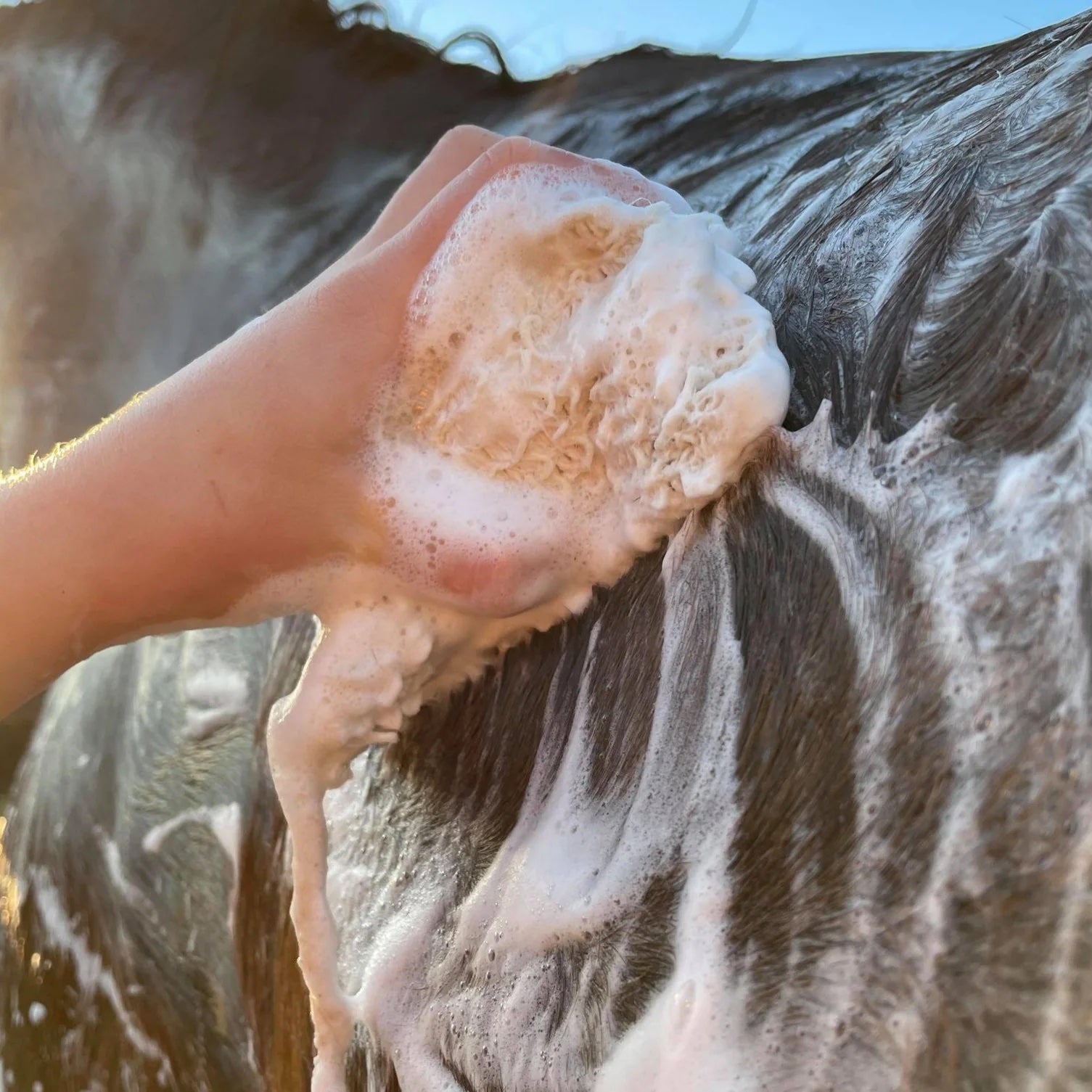Humidifiez la zone que vous souhaitez laver sur le cheval. Placez votre SAVON ÉCOLOGIQUE HAIRY PONY dans le sac en toile de jute et rincez sous l'eau. Frottez le savon sur le pelage, la crinière ou la queue de votre cheval pour obtenir une mousse riche. Rincez à l'eau lorsque vous avez terminé.