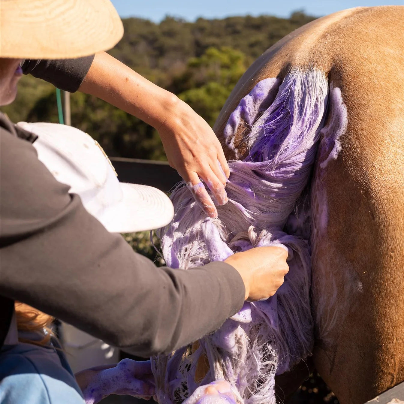 Dites bonjour aux crinières, queues et robes d'un blanc éclatant avec le SHAMPOOING VIOLET DOUBLE FORCE HAIRY PONY.