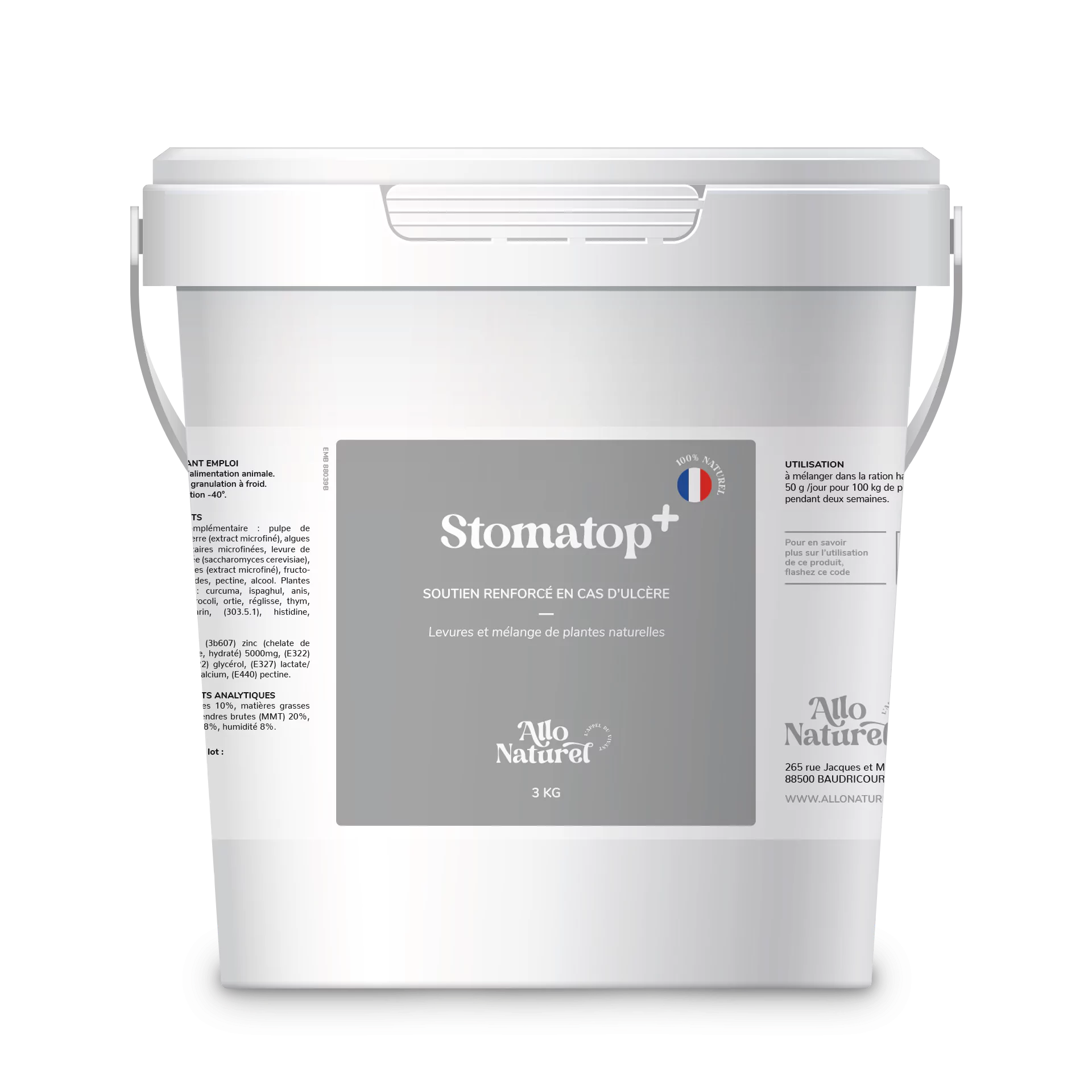 Aliment complémentaire : pulpe de pomme de terre (extract microfiné), algues marines calcaires microfinées, levure de bière inactivée (saccharomyces cerevisiae), algues marines (extract microfiné), fructooligosaccharides, pectine, alcool. Plantes microfinées : curcuma, ispaghul, anis, guimauve, brocoli, ortie, réglisse, thym, souci, romarin, (303.5.1), histidine, alanine.